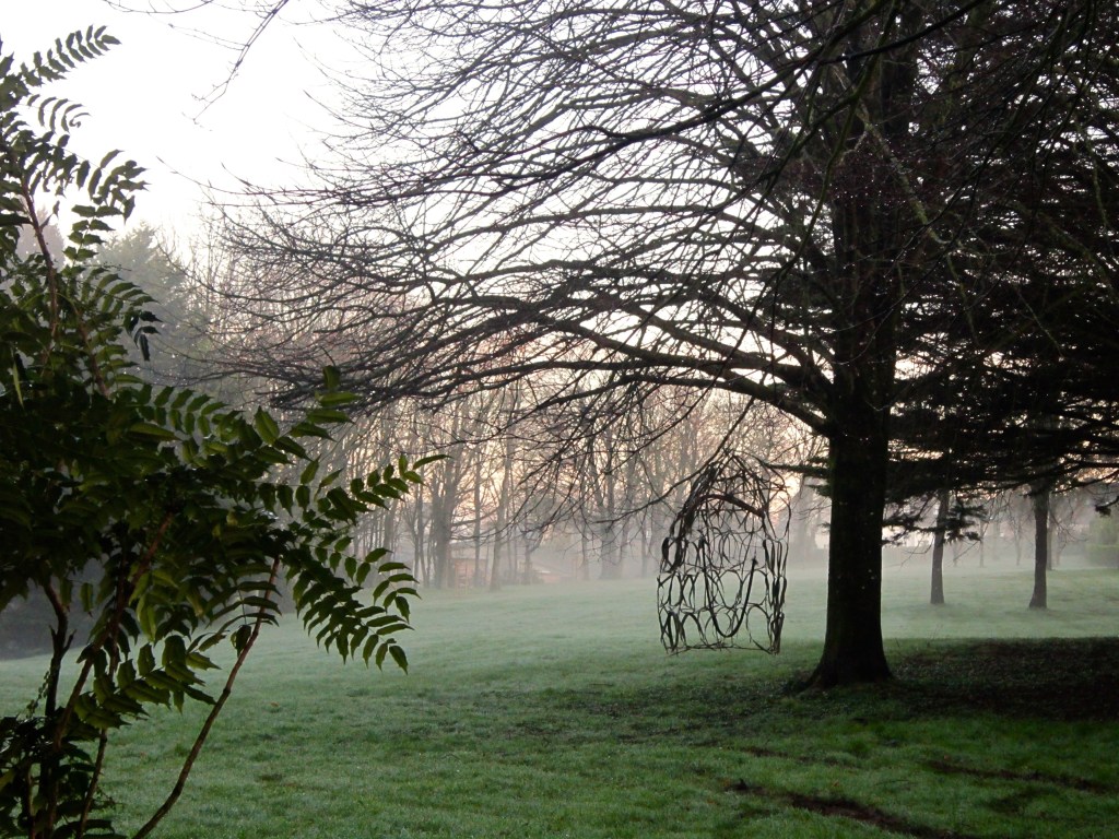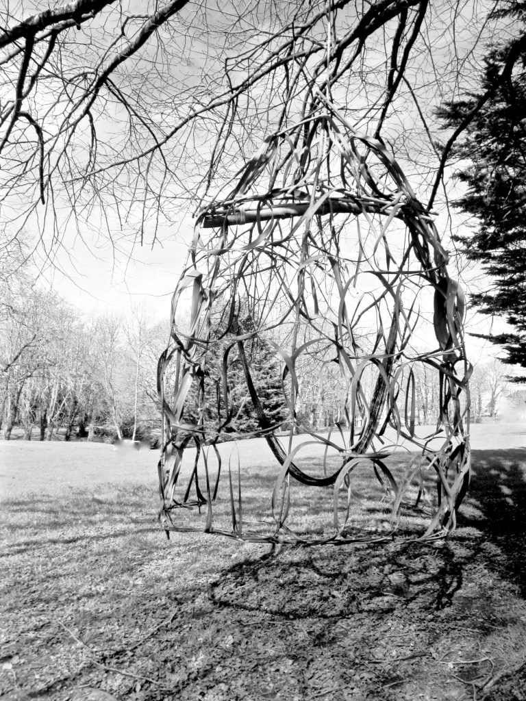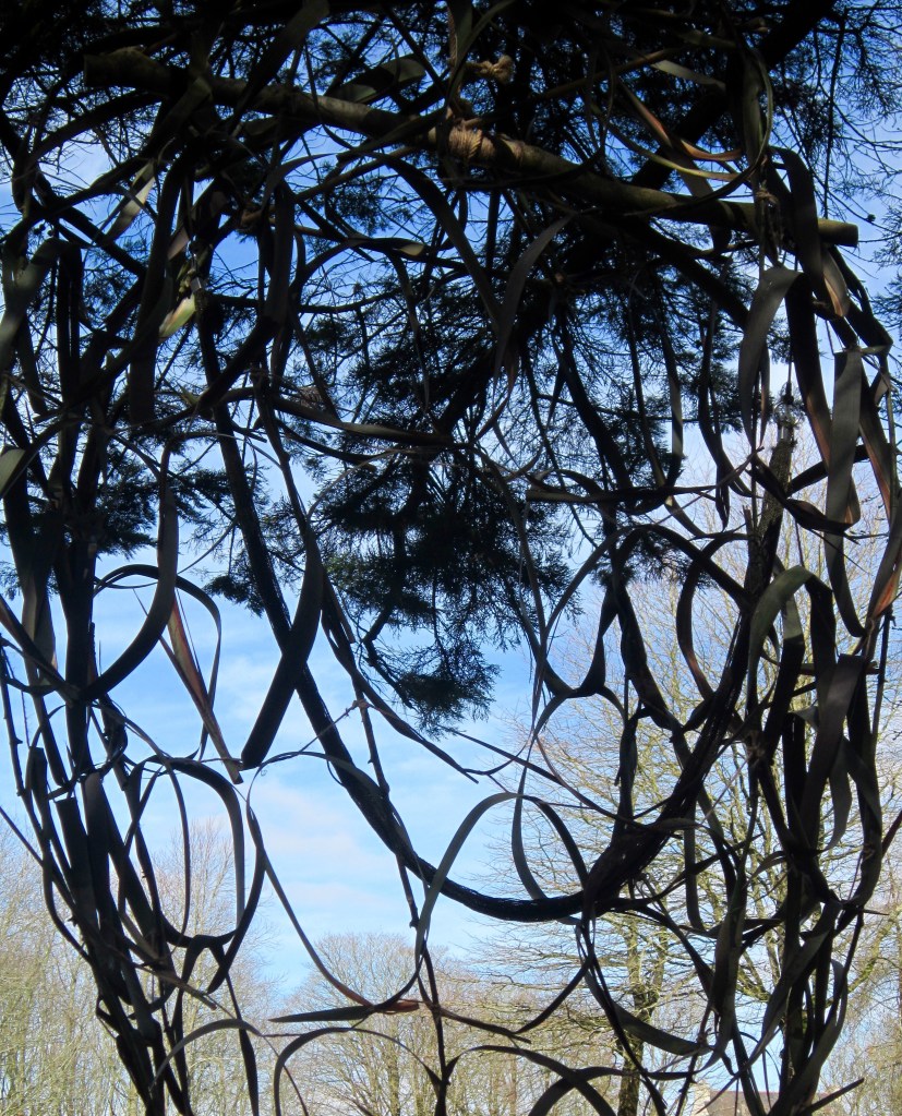 Osmose avec l’arbre, on se laissait porter par la branche. Etre admis comme habitant de la Nature Phormium, bois de houx, ficelle, fil métallique.