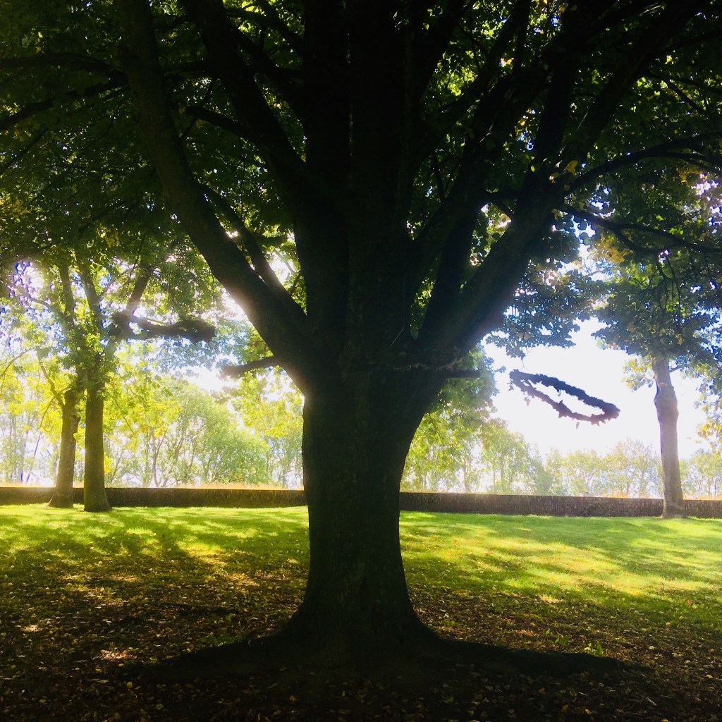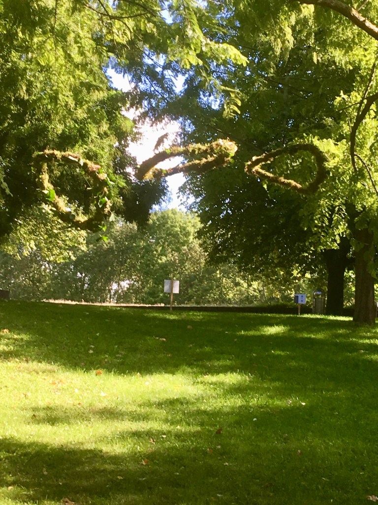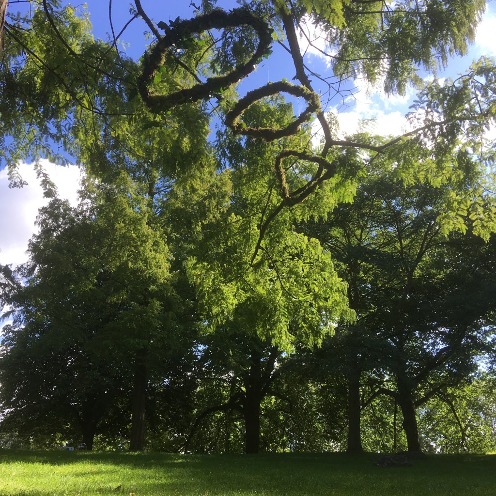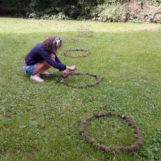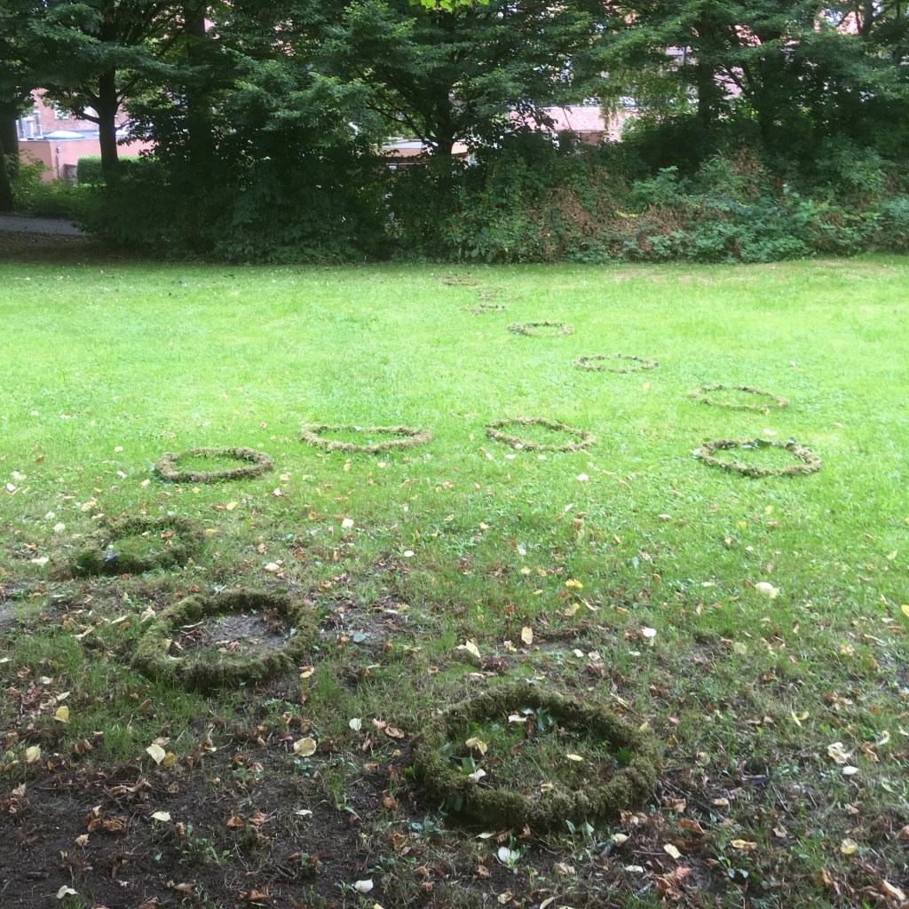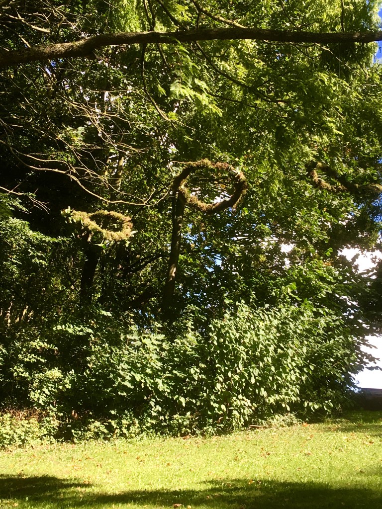 Quinze anneaux de lierre, recouverts de mousse, suspendus par du fil transparent. Diamètre : 1m. L’objectif était de provoquer une surprise, un questionnement, en donnant l’impression que ces anneaux flottaient dans l’air. Jeu de légèreté, de transparance et de magie.