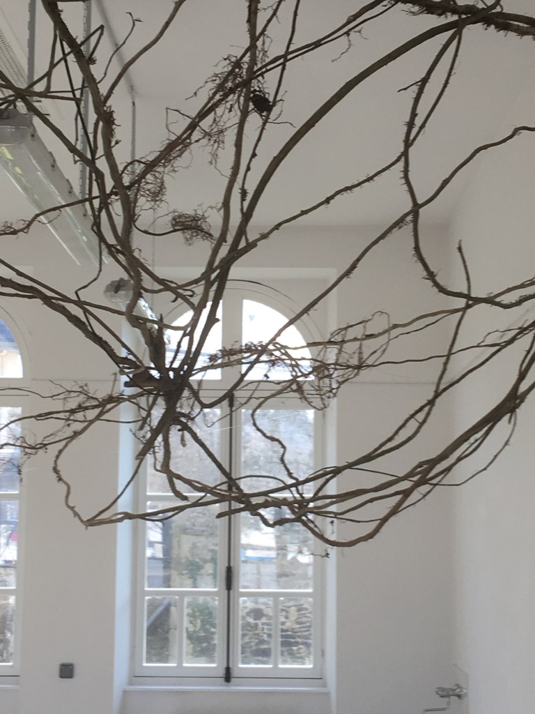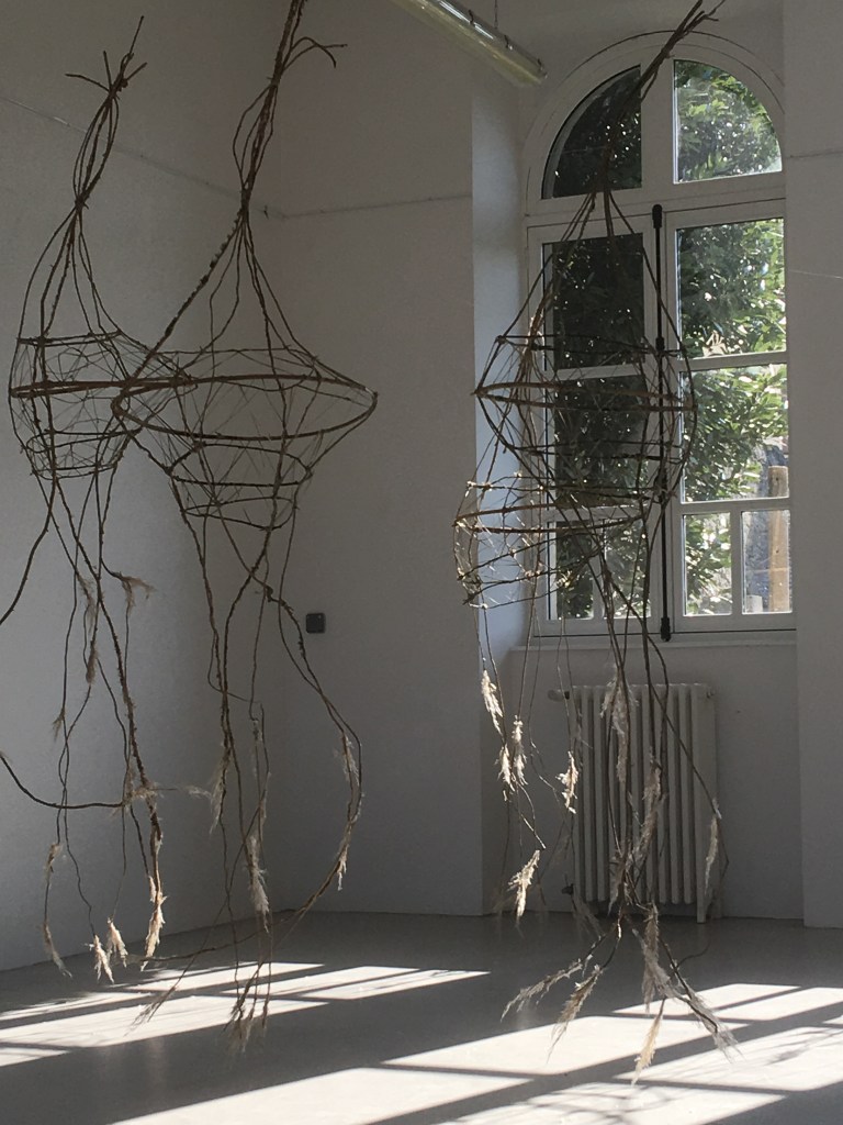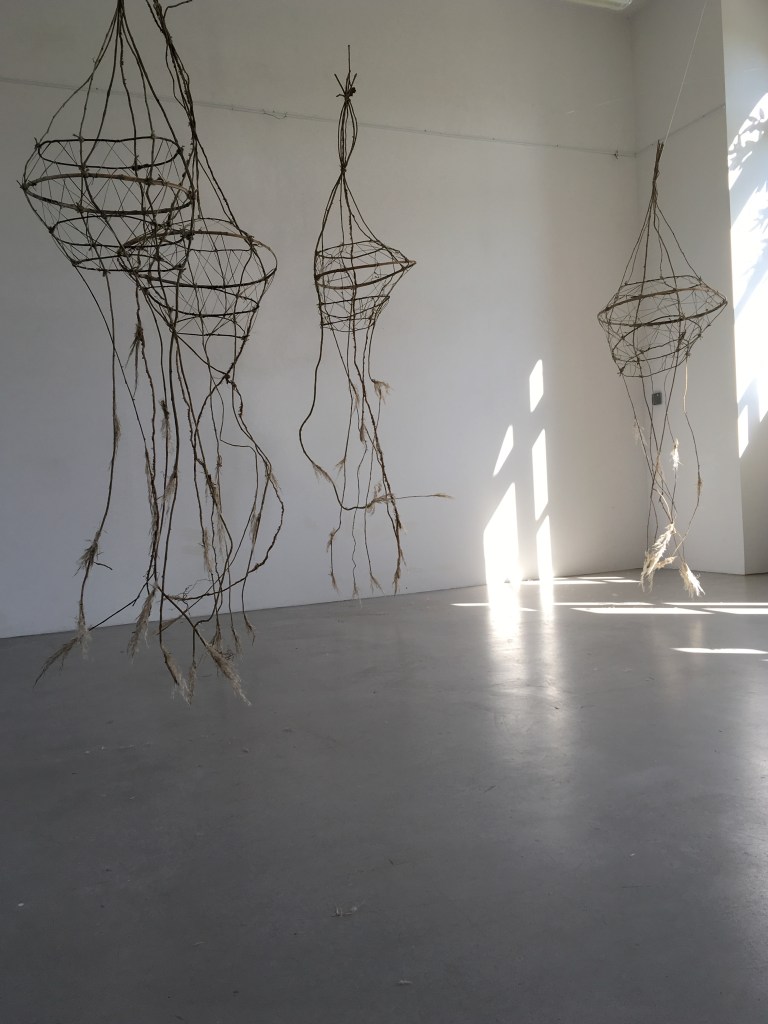 Révéler la poésie du végétal, le modeler, le tisser Cheminement imaginatif vers des actions poétiques. Tissages végétaux naturels et manuels Installation, sculptures, photos Installation : Cinq modules en lierre, houx, bambou, phormium et herbe de la pampa Tissage de lierre Tipi tissé
