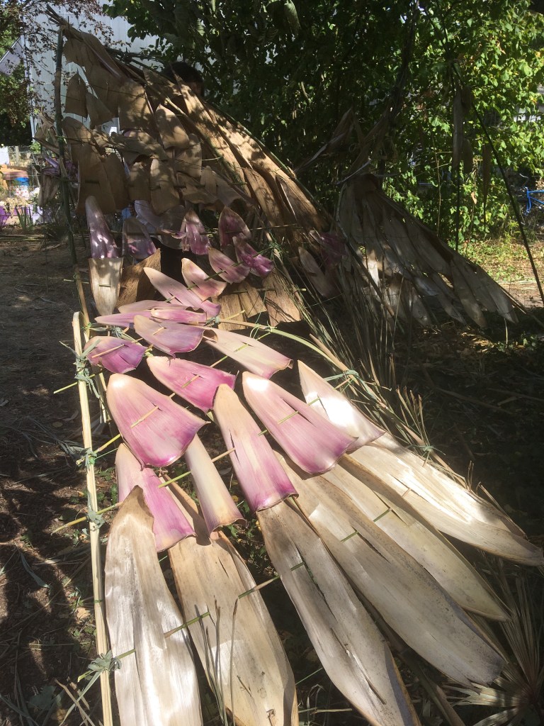 Réalisation d’une oeuvre collective représentant des cahuttes imbriquées dans le cadre des jardins ouverts 2020 à la ferme urbaine « Ville fertile » du jardin d’agronomie tropicale de Vincennes. Écorces de différentes variétés de bambous, bambous.