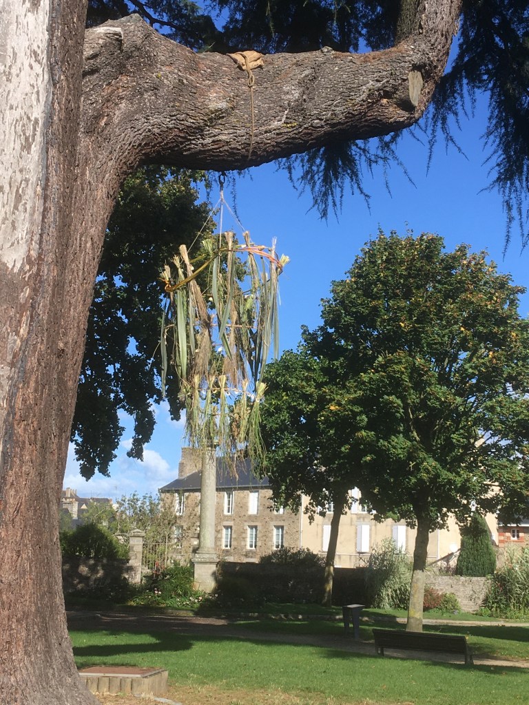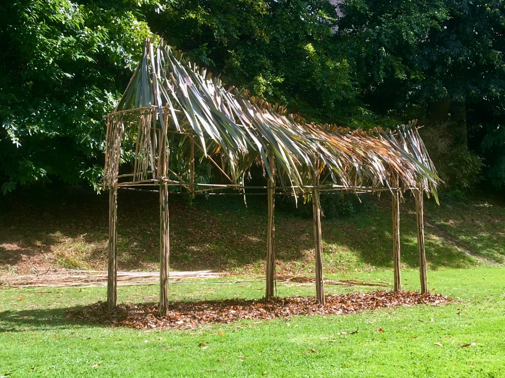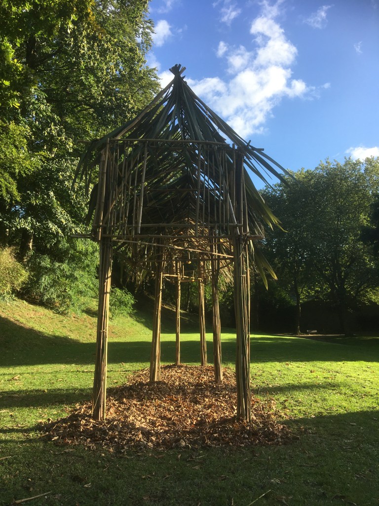L’Art est dans la ville, Dinan, 22 septembre 2020. Hauteur 6m, Longueur 5,5m Bambous, phormiums Maison déformée, allongée, comme aspirée par le vent, par l’oeil d’un cyclone.