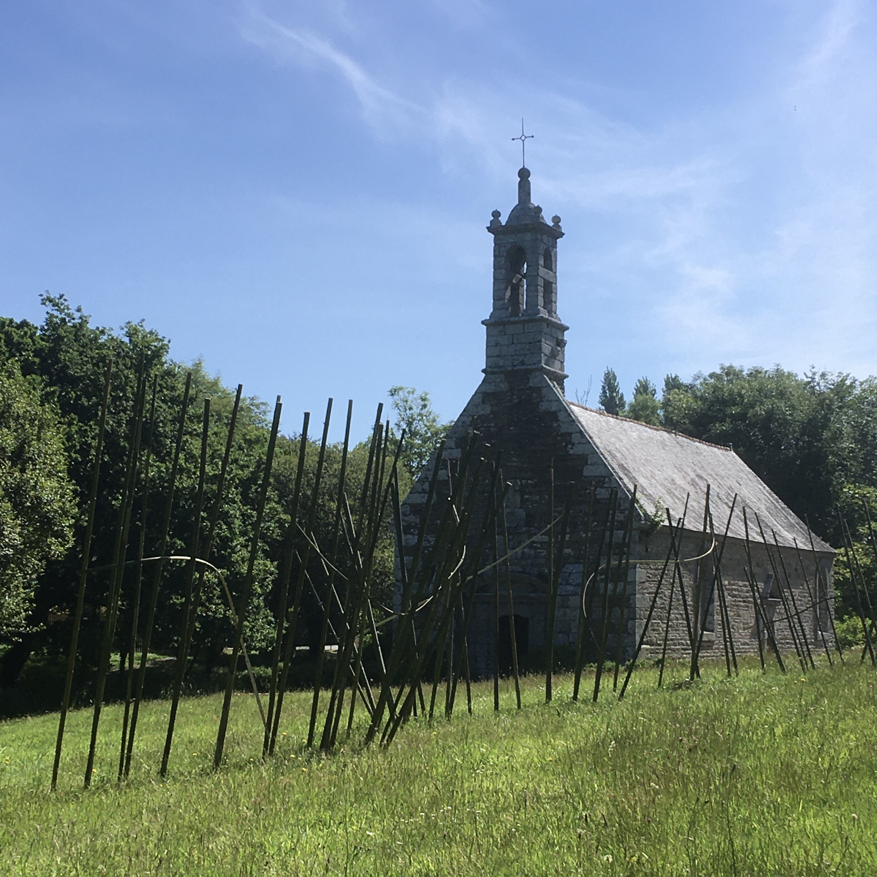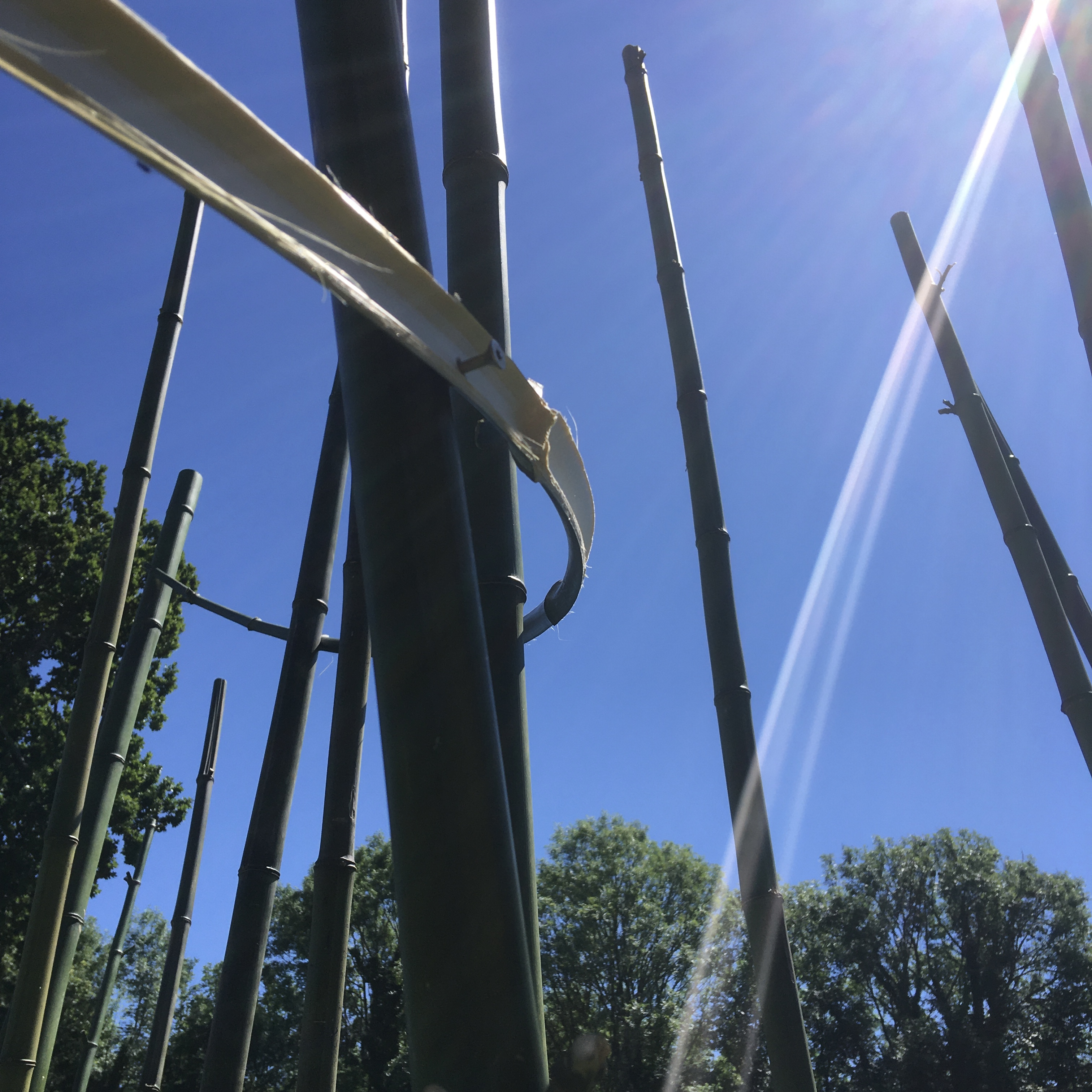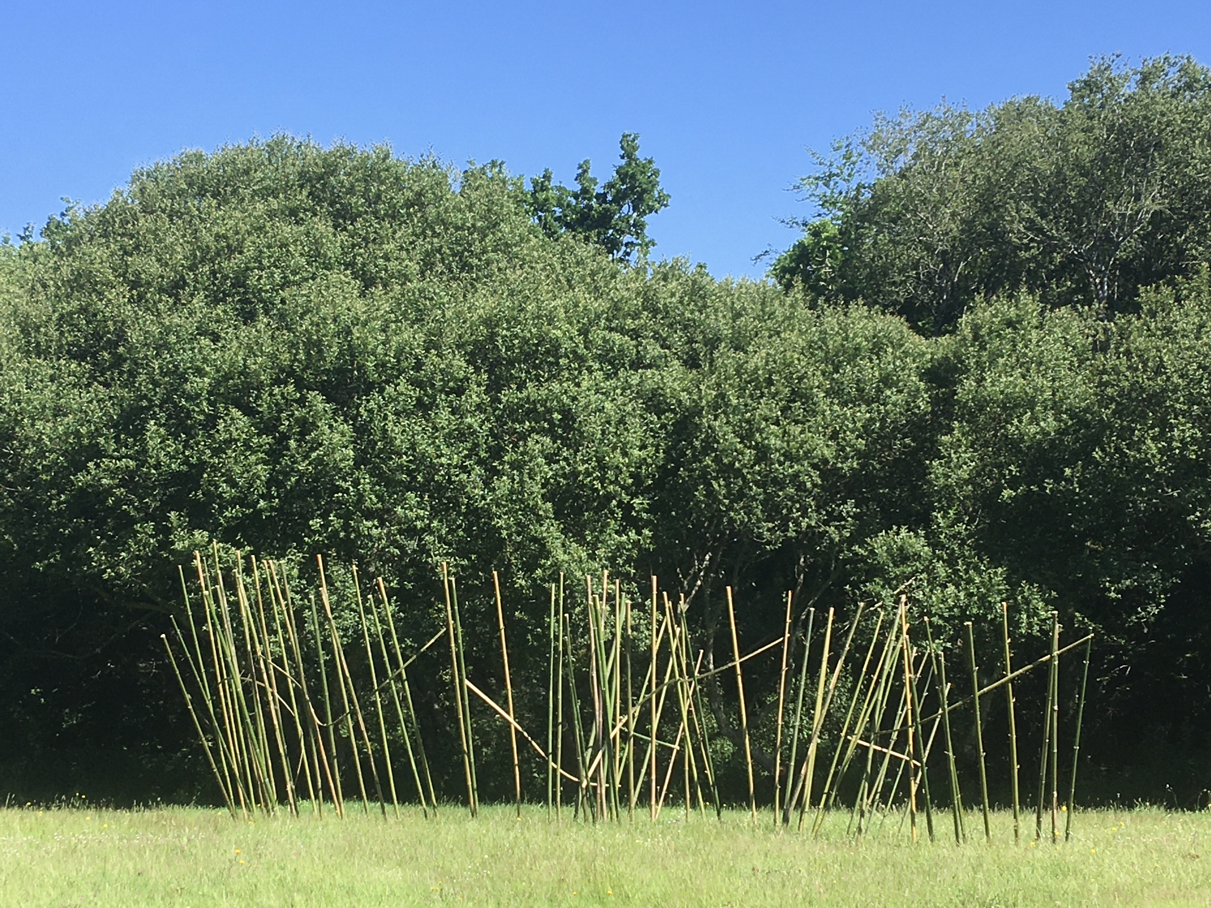 SCHLACK comme le bruit d’un tracé sur un papier. Une ligne qui se place dans l’espace et qui invite au mouvement. Les bambous placés à l’horizontale suivent le mouvement, épousent le mouvement et nous entrainent dans la danse du regard et du corps parfois. Bambous Hauteur variable, longueur 8 mètres Une performance de la danseuse allemande Sophia Wünch a eu lieu autour et dans l’installation lors du vernissage.