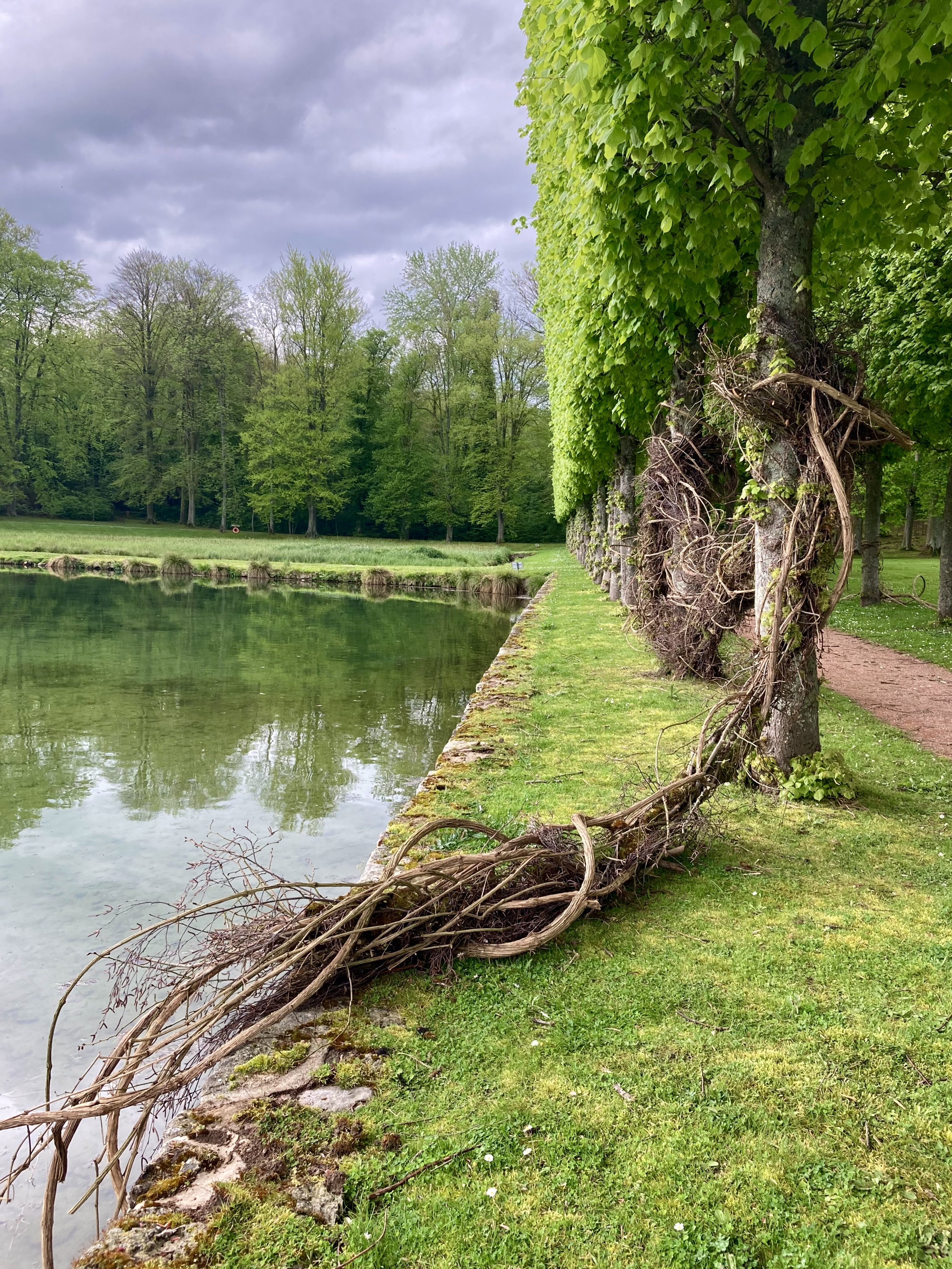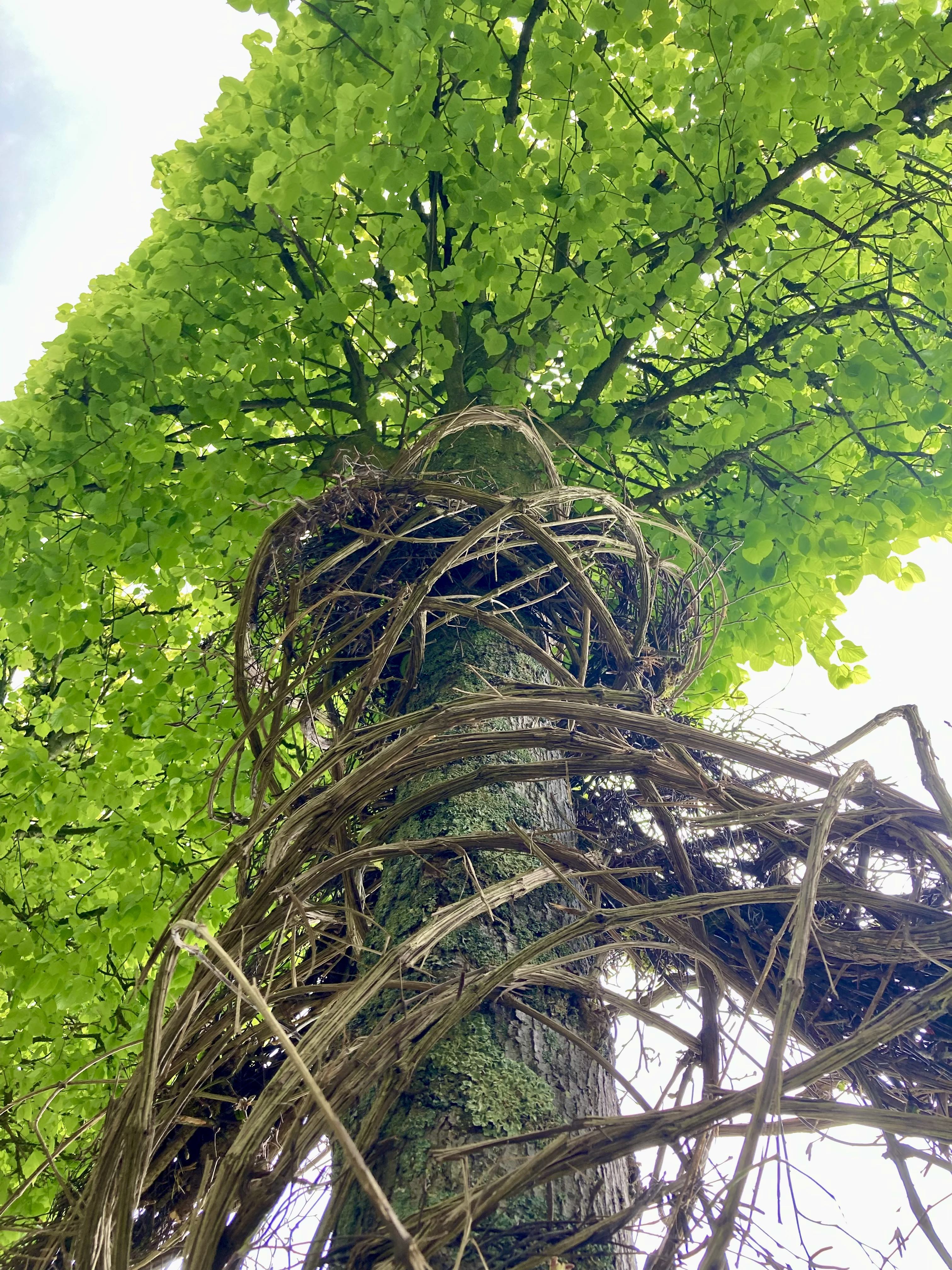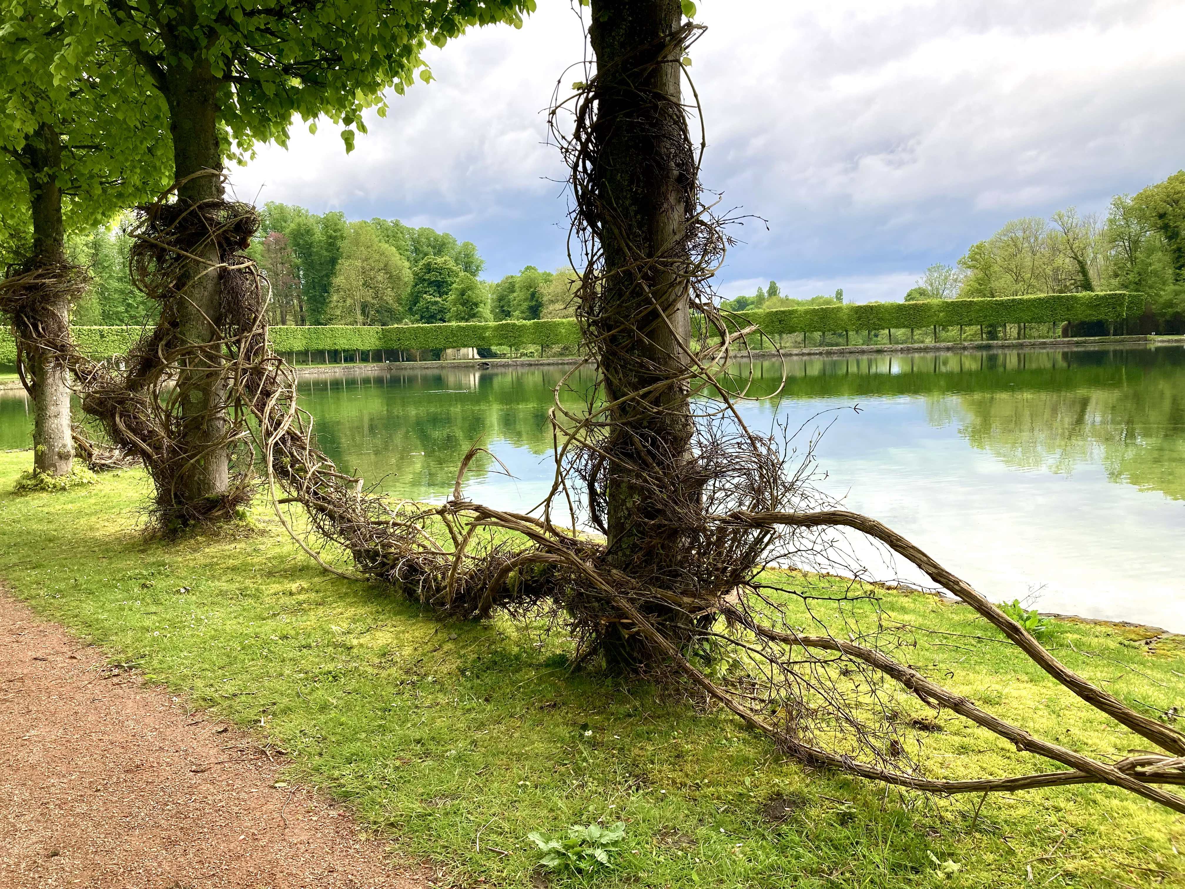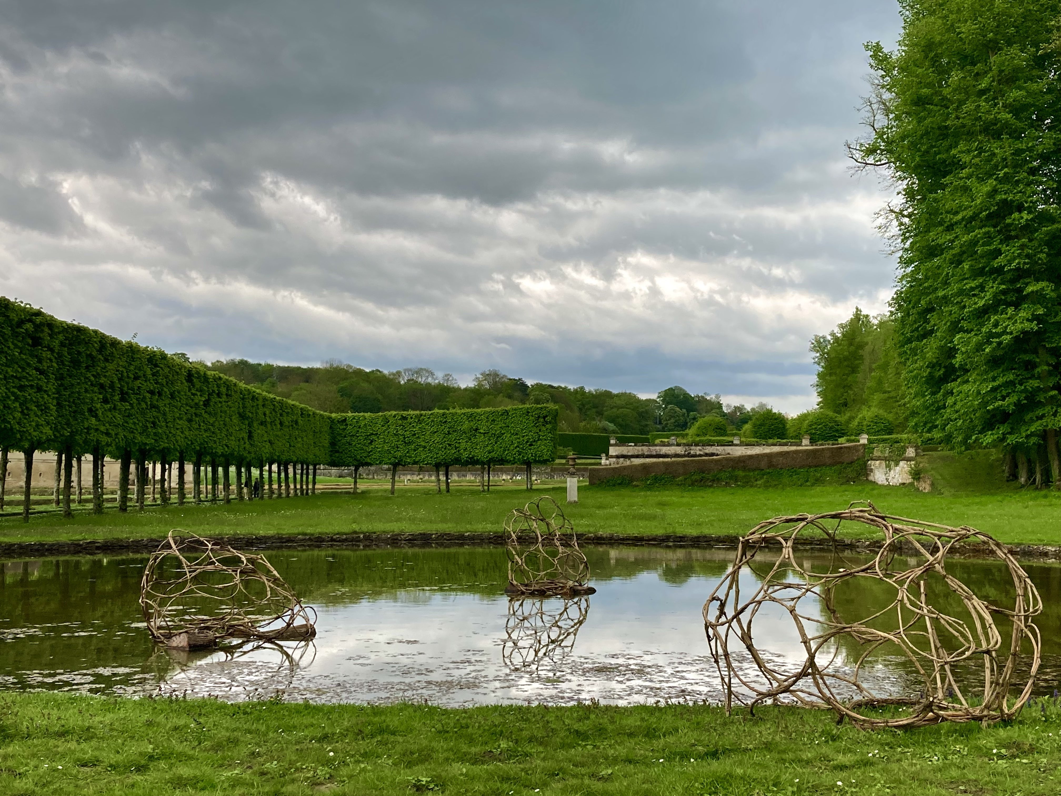 J’ai travaillé essentiellement avec des lianes de clématites géantes collectées dans le bois du domaine de 80 ha.Le lien, la liane sont des thèmes récurrents dans mon travail.Ces lianes envahissent le parc du château, certaines sont immenses, les courbes sont magnifiques.Elles sont capables de prendre possession des lieux, de détruire et d’effacer ce que l’homme a réalisé depuis des siècles, le jardin paysagé.Les travailler, c’est comme une chorégraphie,La collecte est très physique. Elles peuvent mesurer des dizaines de mètres.Dans un deuxième temps il faut les démêler, à cette étape, on s’emmêle, on les observe en étudiant les entrelacs, les noeuds, on est pris par la liane.Puis je les tisse en les liant avec l’eau, les arbres, l’air, les regards des promeneurs…Le site est classé monument historique, Natura 2000 et jardin remarquable.
