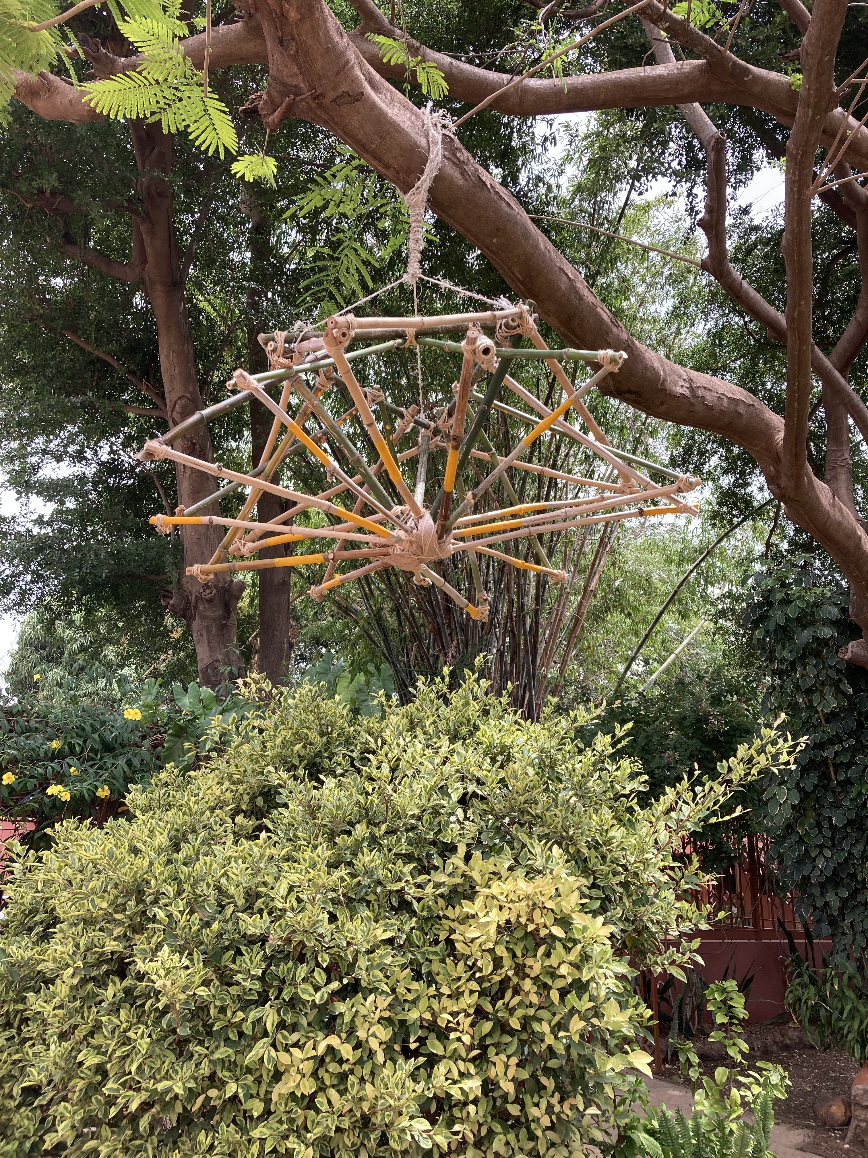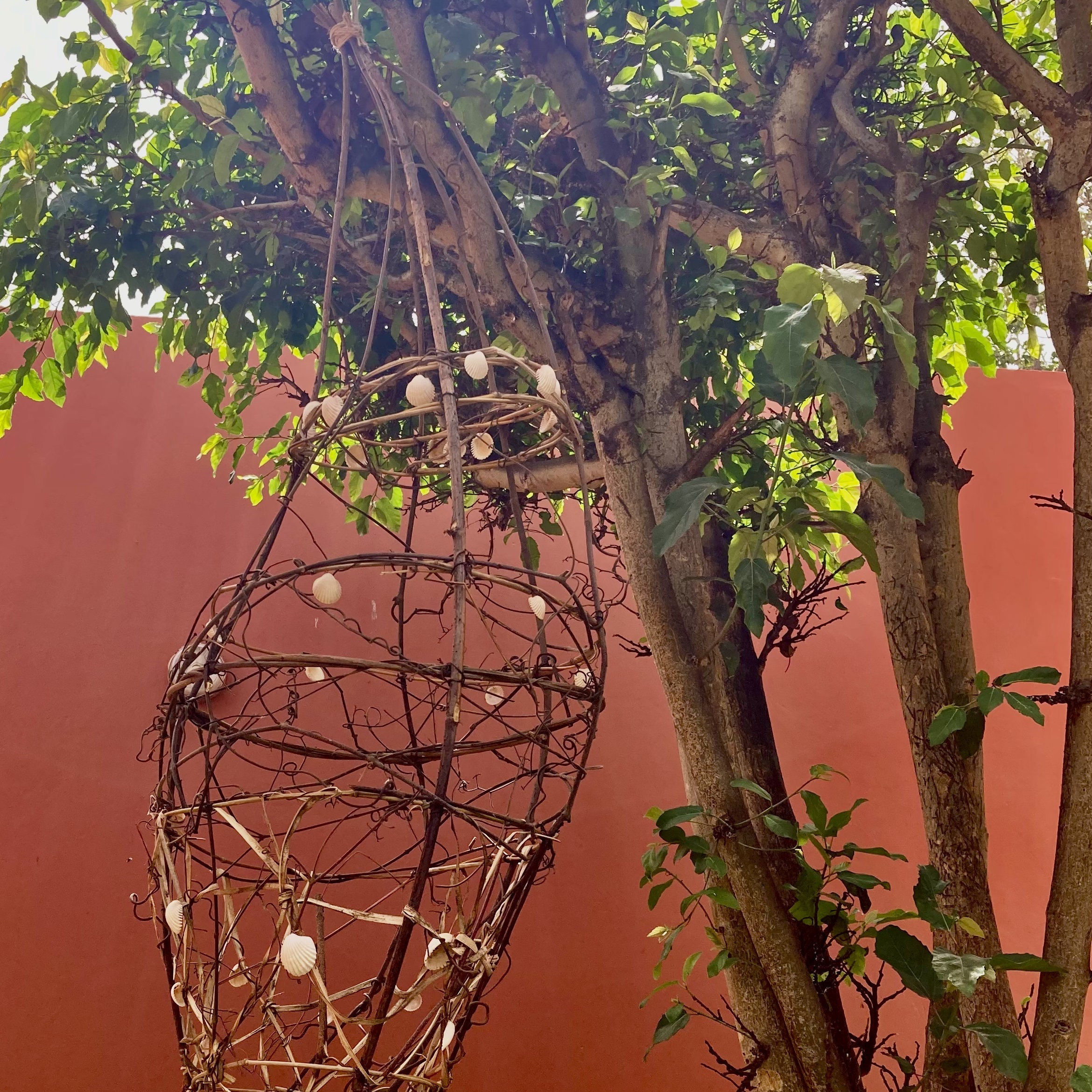 3- Sphère tissée : mobile suspendu, on pourrait penser à une nasse de pêche mais cette sculpture ne piège rien et laisse libre les insectes et oiseaux de l’investir au gré de leur envie.