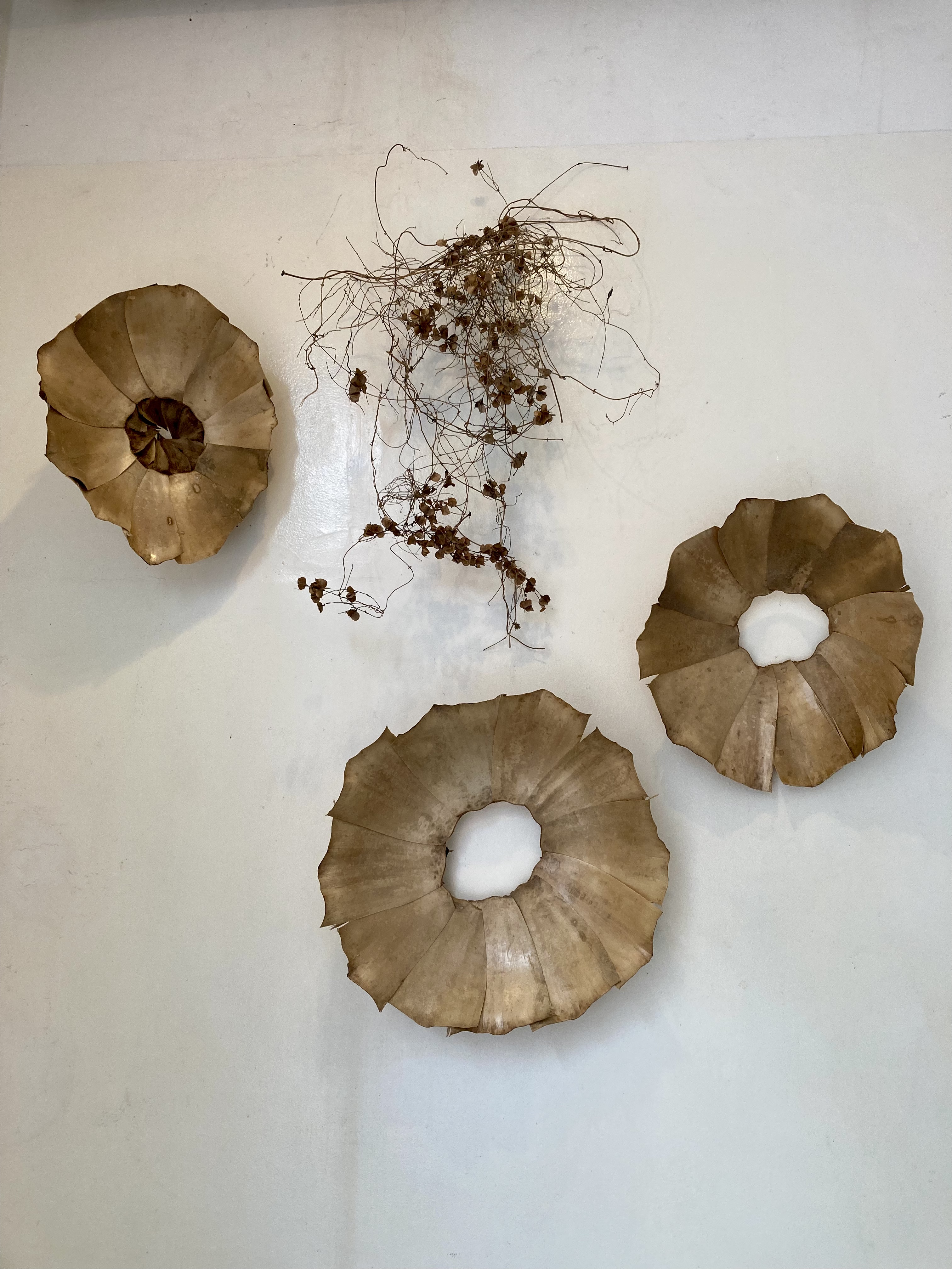 Des écorces de bambous créent des fleurs imaginaires, volumineuses, des végétaux séchés sont mis en scènes dans une nature réinventée.