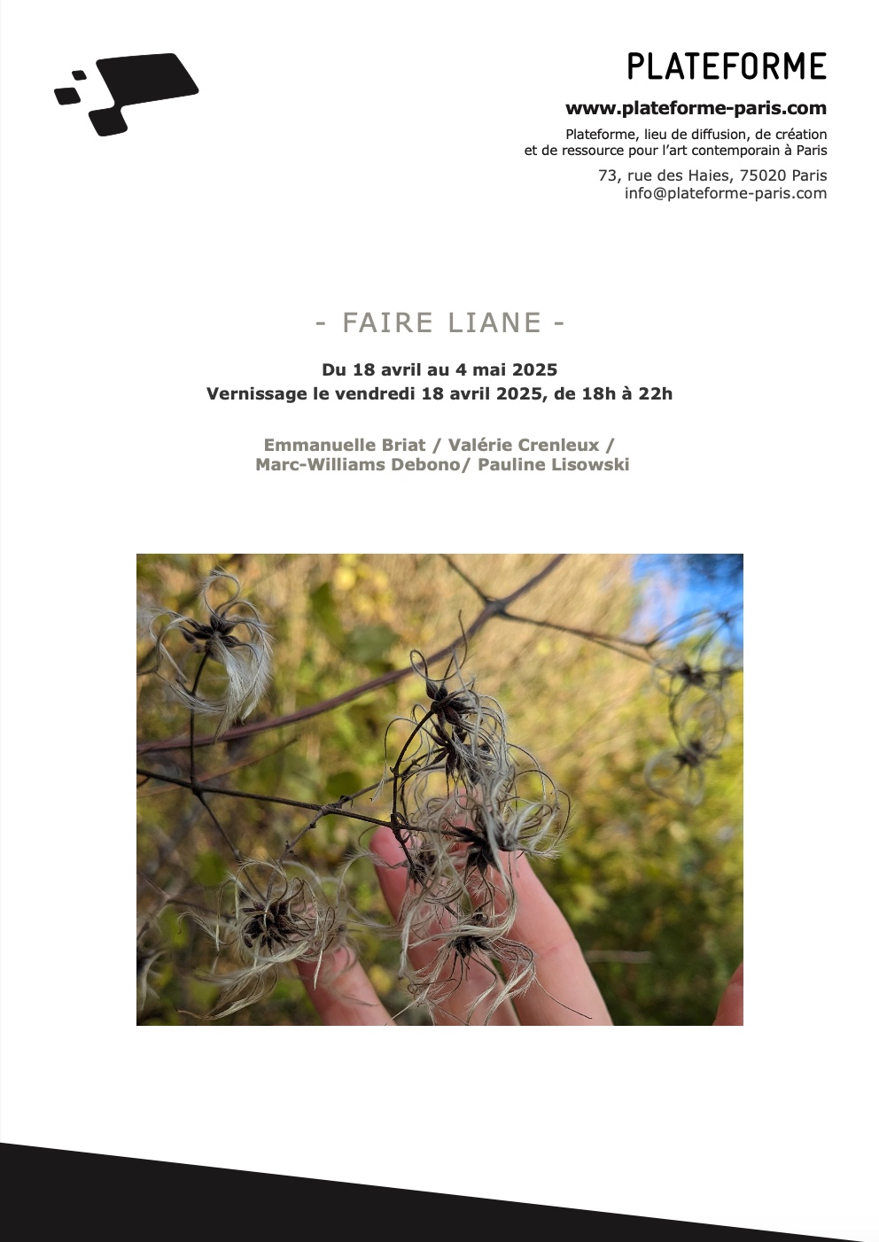 Exposition collective du collectif FAIRE LIANE : Pauline Lisowski, artiste, jardinière, critique d’art et journaliste, Valérie Crenleux, plasticienne, Marc Williams Debono, neuro-biologiste végétal, poète, Emmanuelle Briat. plasticienne.