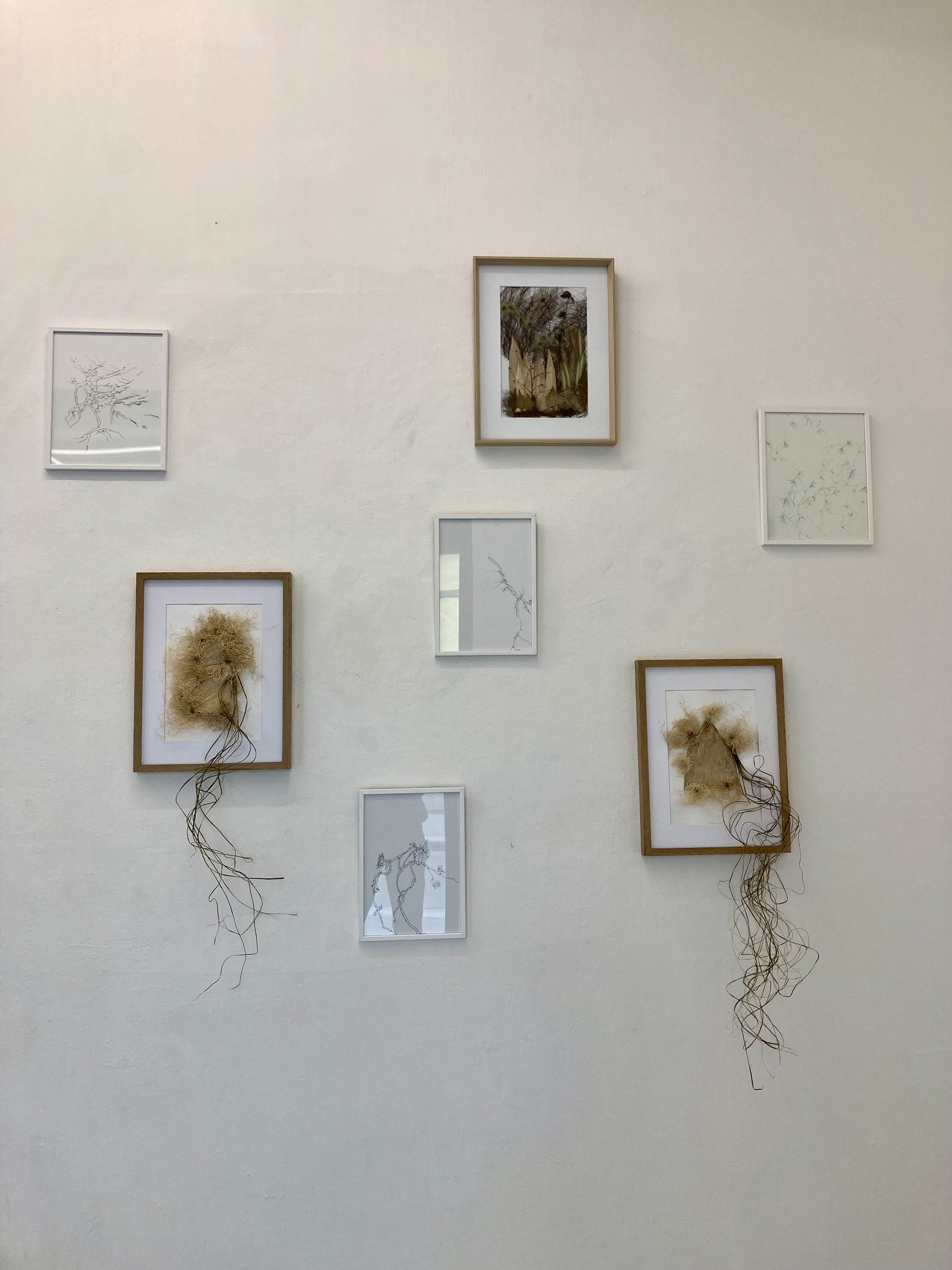 Dans un accrochage de la terre au ciel, les dessins de Pauline Lisowski, entre lianes et racines, font apparaître des jardins de mémoire : des lieux refuge où entrer en connexion avec ces plantes qui se relient à d’autres et trouvent appui sur différentes structures. Dans son jardin, l’artiste jardinière laisse ces espèces grandir, chercher la lumière et des accroches. Elle accompagne le vivant dans sa croissance à la fois en le guidant et en observant son développement.