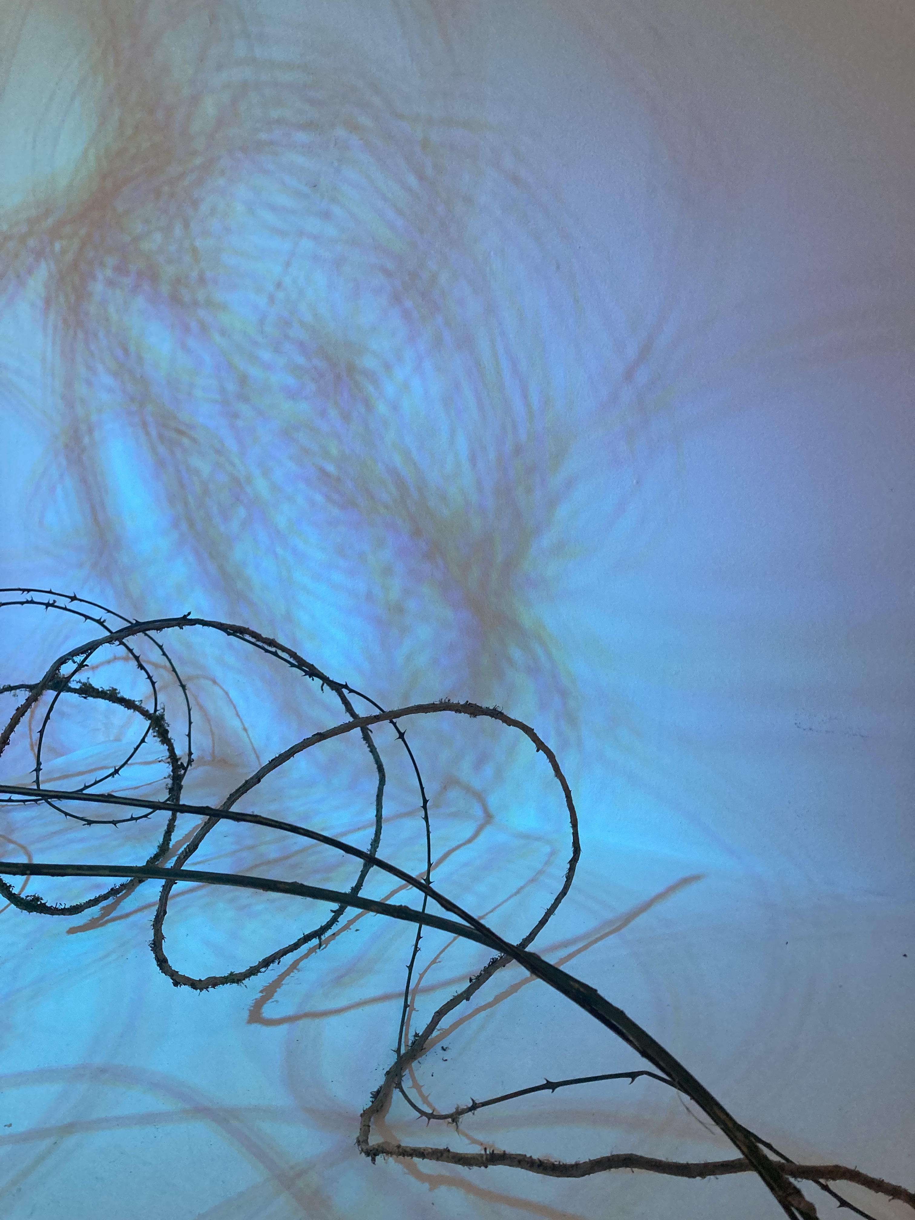 Valérie Crenleux donne à voir les pétiolules de clématites sauvages qui attirent sa curiosité. Avec elles, l’artiste dessine des écritures anciennes et construit un langage. Par la légèreté de leur mouvement, les pétiolules nous invitent à les suivre pour imaginer leur développement. Ces vrilles volubiles se fixent à toutes sortes de supports.